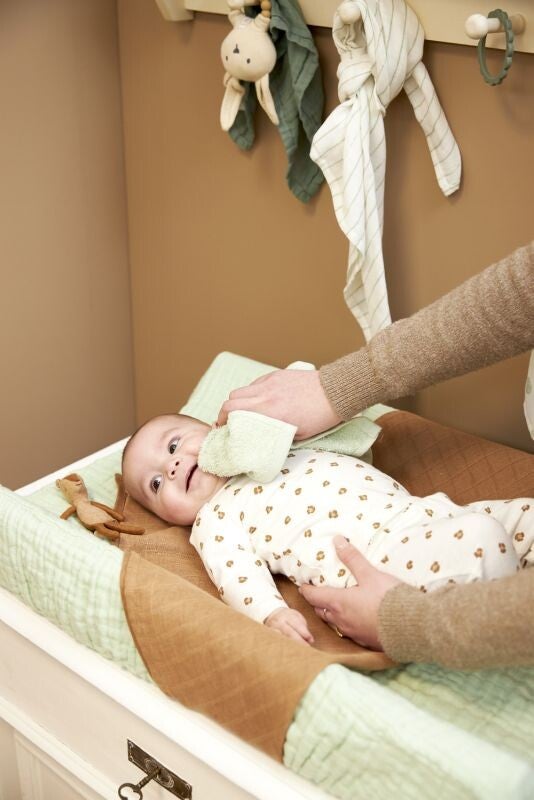 De spuugdoek is gemaakt van 100% katoen badstof. Hierdoor voelt het heerlijk zacht en comfortabel aan het huidje van je baby. Ook neemt het materiaal vocht goed op en is snel weer droog